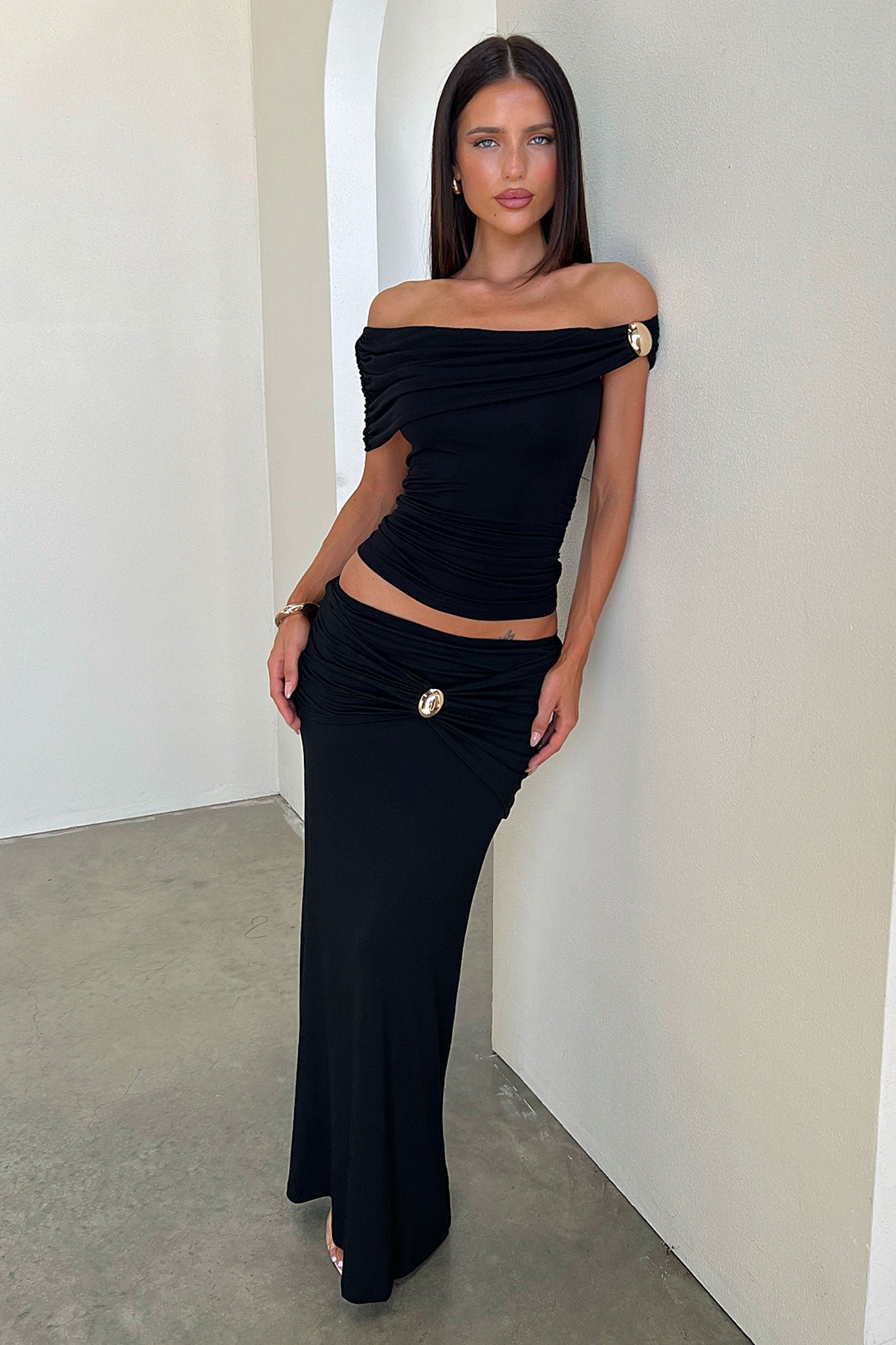 The Malika Off-Shoulder Top in Black is your new go-to for effortless glam! Featuring a fold-over off-shoulder neckline, ruched sides, and a soft stretchy fabric that hugs in all the right places, this flattering silhouette is finished with luxe gold shoulder detailing for an elevated touch. Pair it with the matching maxi skirt for a sleek, coordinated look perfect for your next night out!